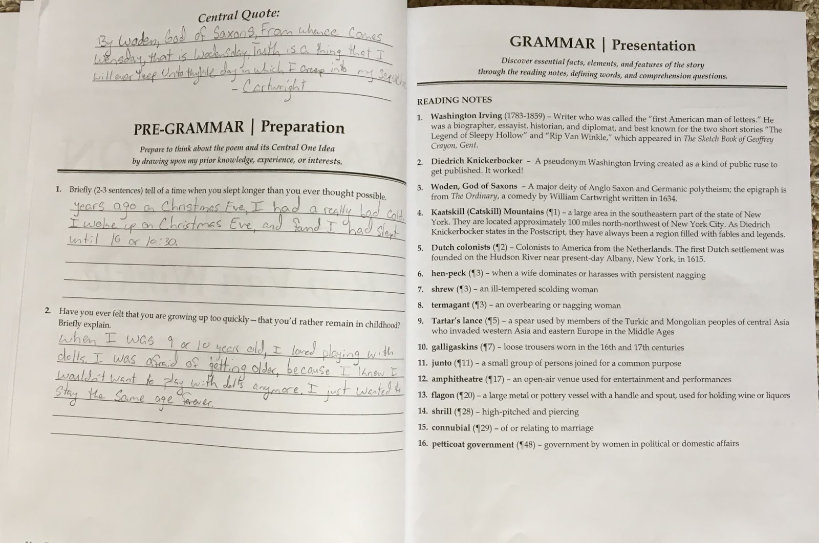 I had originally considered working through the material at a faster pace for this review period, in order to get a better feel for the curriculum. I quickly discovered that that was not going to work. There is simply so much to work through, and my daughter would be too overwhelmed. So, for the most part, we focused on one section per day. When short enough, we did two. Usually the Pre-Grammar and Notes were combined. Typically, the remaining assignments, the vocabulary, comprehension questions, and so on, were (and are) completed a day at a time. Again, some of those sections could go faster, but then material will be missed.